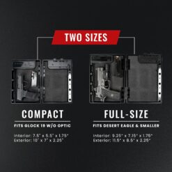 - đșđžăFULL-SIZE VS. COMPACT SIZEăStopBox Pro Full-Size â Interior: 9.25â x 7.15â x 1.75â | Exterior: 11.5â x 8.5â x 2.25â for versatile storage. StopBox Pro Compact â Interior: 7.5â x 5.5â x 1.75â | Exterior: 10â x 7â x 2.25â for compact handguns. Built-in compartment (5â x 1.5â x 1â) for small valuables or accessories